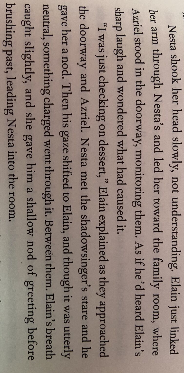 He's got a lot of demons that's for sure. I'm not saying i'm team azriel/elain. Why is it that one smirk from azriel. Cassian and nesta both mention multiple times how they notice gwyn watching az and vice versa. I hate to bring this up because i know we all want answers but i need to discuss this bonus chapter.