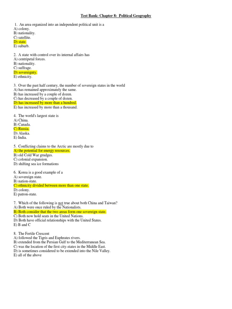 Ap Human Geography Chapter 8 Political Geography Study Guide Answers