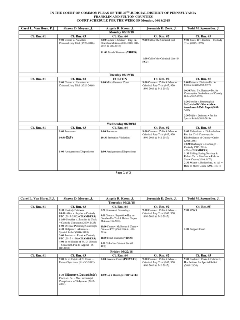 Franklin County Court of Common Pleas Schedule June 1822, 2018