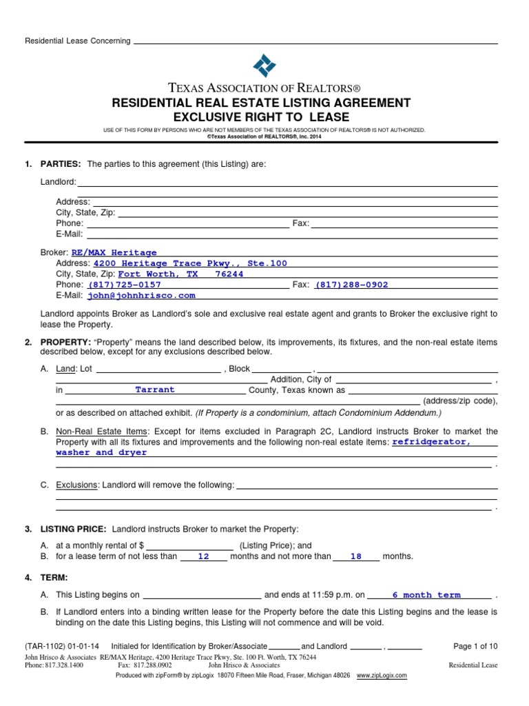 Use of this form by persons who are not members of the texas association of realtors®, inc. This is common with owners and usually attributed to changing the listing end date, sales price (reduction), cease marketing the property, or any other modification. There are two (2) main types of listing agreement, an exclusive agreement (the most common type) and an.