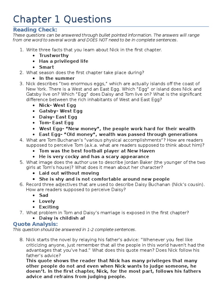 great gatsby questions chapter 1 Fiction & Literature