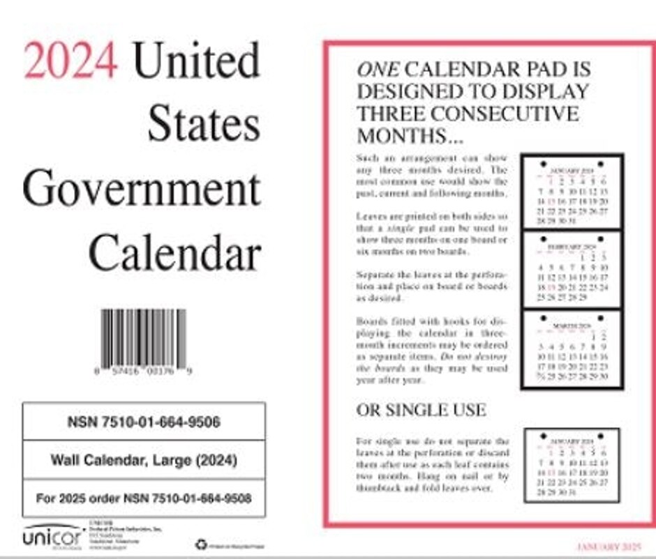 United States Government Calendar 2024, Display 3 Months, 10/pack